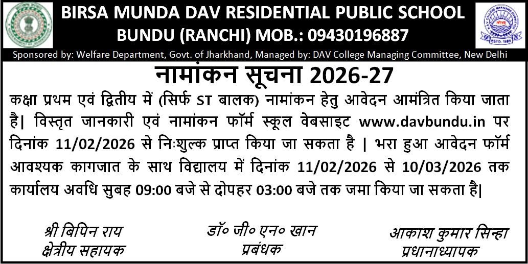 BIRSA MUNDA DAV RESIDENTIAL PUBLIC SCHOOL BUNDU, RANCHI-835204 (JHARKHAND) PHONE : 9430196887 EMAIL : bmdavbundu@gmail.com